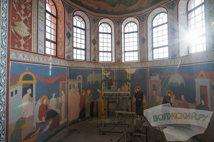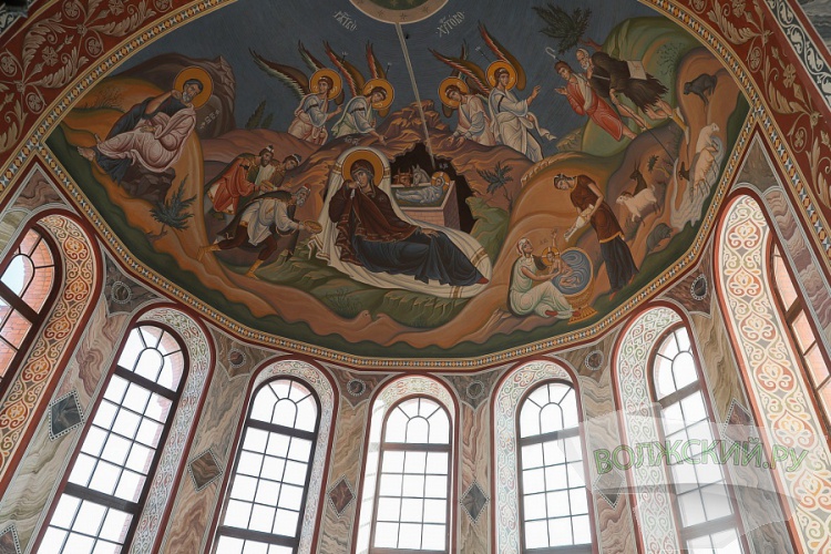 Как сообщили Волжский.ру в пресс-службе региональной администрации, роспись стен выполняют художники Павловской мастерской. Уже завершена работа в верхней части храма, в северной апсиде написана композиция «Воскресенье», в южной апсиде в преддверии 7 января завершается создание фрески «Рождество Христово». Изображения святых нанесены на колонны и медальоны, на 80% закончен орнамент на откосах окон. В притворе прихожан будет встречать композиция «Звездное небо», а свод храма украсит «Образ Спасителя».