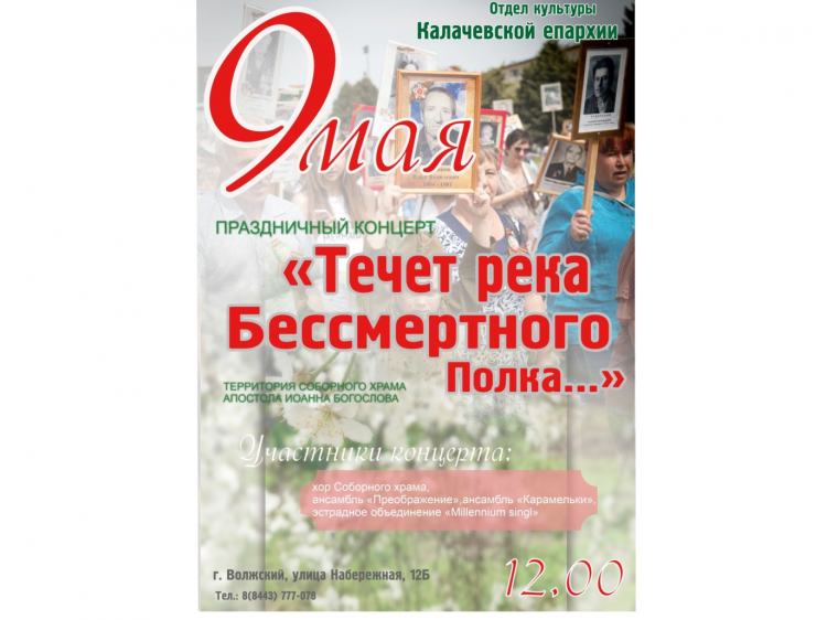 В воскресенье, 9 мая, на территории Соборного храма Иоанна Богослова состоится праздничный концерт под названием «Течёт река Бессмертного полка…» (0+).