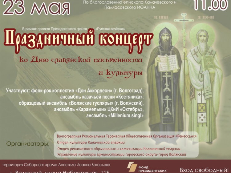 В воскресенье, 23 мая, в Волжском состоится праздничный концерт, посвященный Дню славянской письменности и культуры (0+).