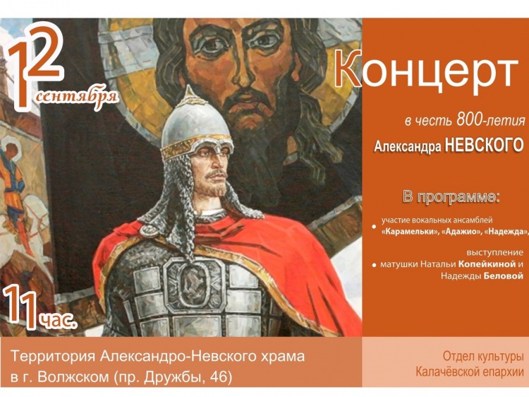 12 сентября в День памяти Святого благоверного князя Александра Невского в Волжском пройдёт праздничный концерт.