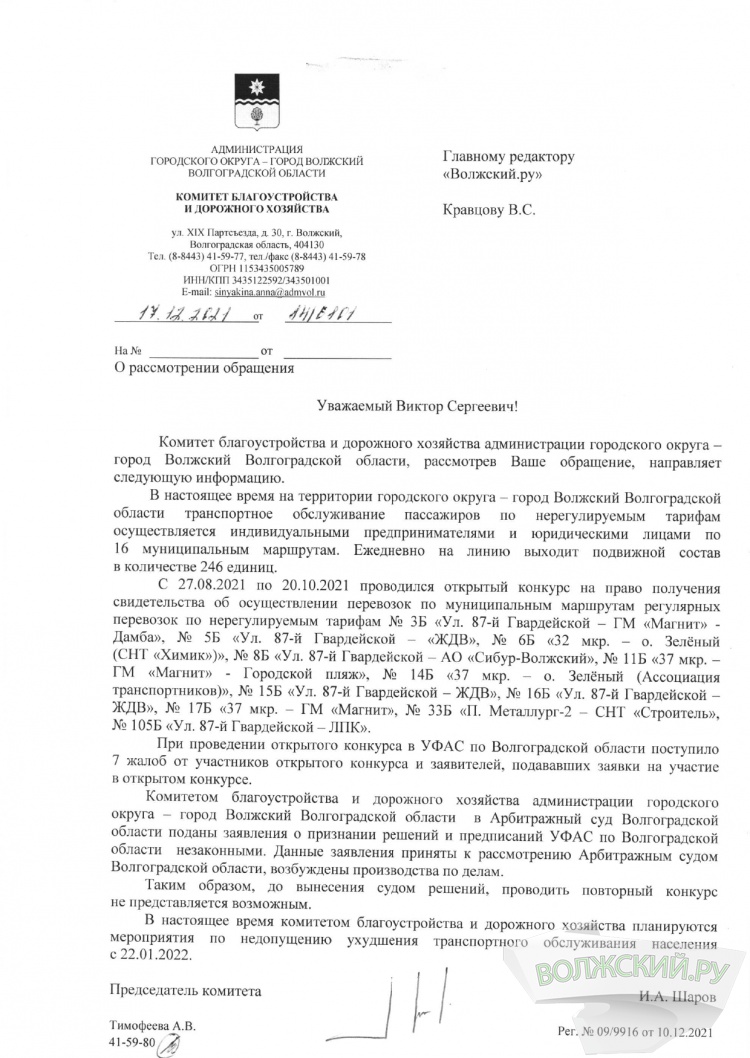 – В настоящее время комитетом благоустройства и дорожного хозяйства планируются мероприятия по недопущению ухудшения транспортного обслуживания населения с 22.01.2022 года, – сообщает председатель КБиДХ Иван Шаров в своём ответе редакции.
