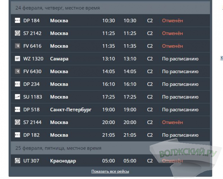 На онлайн-табло сайта Международного аэропорта Волгоград начала появляться информация об отмене рейсов ряда авиакомпаний, в том числе «Победы», «России», «ЮтЭйр». Официально аэропорт о приостановлении работы пока не сообщает.