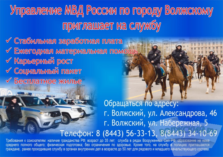 УМВД по городу Волжскому приглашает на службу мужчин до 35-40 лет, прошедших службу в Вооруженных силах РФ.