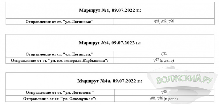 В связи с перекрытием изменения также вносятся в расписание движения трамваев. Как сообщили Волжский.ру в МУП «Волжская автоколонна № 1732», в субботу, 9 июля и 16-17 июля, в расписании трамваев № 1, 4, 4а сохраняются только отправления до 7 часов утра.