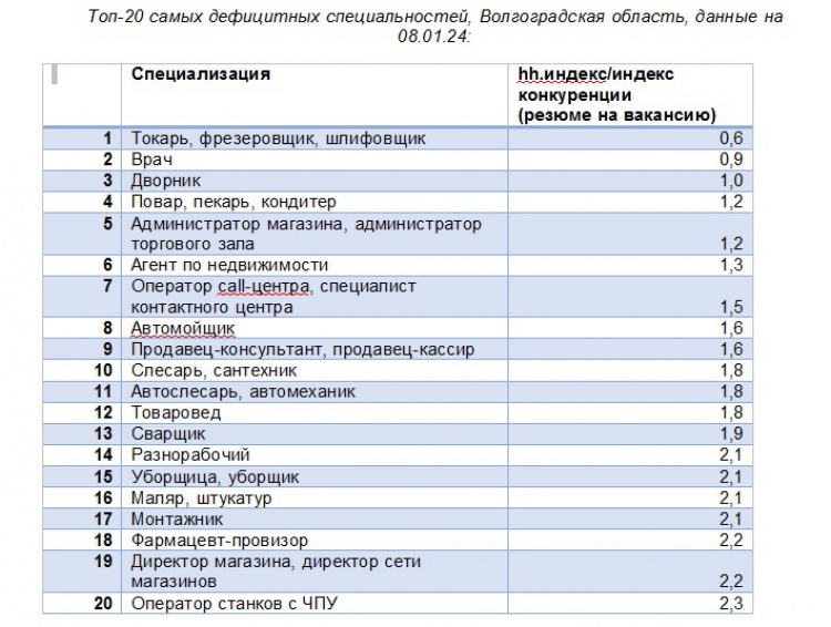 По итогам года средний уровень конкуренции на рынке труда в стране и регионе составил 3,5 пункта, то есть на одну вакансию приходилось 3,5 резюме При этом летом и осенью показатель падал до 3,1-3,3 пунктов, что является абсолютным антирекордом за все время наблюдений. Специалисты называют такую ситуацию «рынком соискателя» – когда не потенциальные сотрудники вынуждены бороться за рабочие места, а работодатели пытаются заманить их. Как сообщили Волжский.ру в пресс-службе hh.ru Юг, топ-20 самых дефицитных специальностей Волгоградской области возглавили токарь, фрезеровщик и шлифовщик, у которых индекс составил 0,6 пункта. На одну вакансию врача приходится 0,9 резюме, а на место дворника – одно.