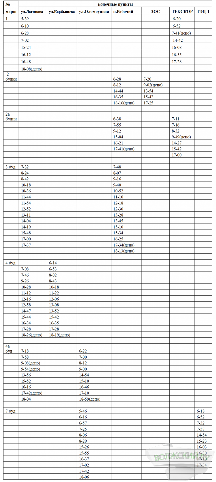 Изменения в расписании коснутся расписания будних дней на маршрутах № 1, 2, 2а, 3, 4, 4а, 7. Как стало известно Волжский.ру, особенно катастрофически нововведение отразится на работе маршрута № 1, который фактически перестанет существовать и по будним дням будет совершать 1(!) рейс в день в 18.46 часов. Все остальные рейсы будут отменены. Маршруты № 3 и 4 лишатся почти половины отправлений в каждом направлении, а маршрут № 7 - трети. Из расписания выводятся следующие рейсы по маршрутам (подробнее...).