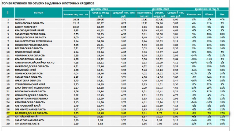 В среднем по стране за месяц объемы ипотеки выросли на 5% при том, что общее количество новых кредитов сохранилось на уровне ноября. Лидерами по объемам ипотечного кредитования стали регионы: Москва, Московская облать, Санкт-Петербург, Краснодарский край и Татарстан. Такие данные приводит Объединенное Кредитное Бюро (ОКБ). Волгоградская область вошла в ТОП-30 регионов, в которых наблюдается наибольший рост ипотечного кредитования в денежном выражении.