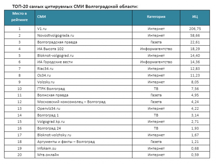 Лидерами рейтинга цитируемости стали электронные издания V1, НовостиВолгограда.ру и газета «Волгоградская правда». Нижние строчки заняли АиФ - Волгоград, Infokam.su и МТВ.онлайн.