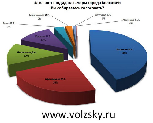 На сайте www.volzsky.ru проводится опрос "За какого кандидата в мэры города Волжский Вы собираетесь голосовать?". По результатам голосования расклад сил таков: первое место уверенно занимает нынешний градоначальник - Игорь Воронин («Единая Россия»). На втором месте, с большим отрывом - Марина Афанасьева («Справедливая Россия»). Третье место занял Дмитрий Литвинцев («ЛДПР»), вплотную к нему находится Николай Паршин («КПРФ»). За неделю поменялись местами Паршин и Литвинцев, причём последний немного увеличил отрыв.