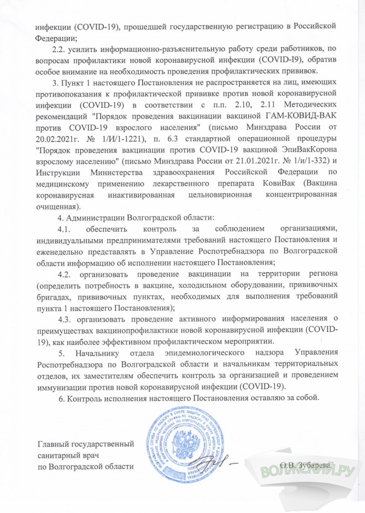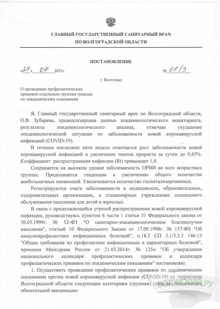 Во вторник, 27 июля, главный санитарный врач Волгоградской области Ольга Зубарева подписала постановление № 01/3 об обязательной вакцинации отдельных категорий граждан.