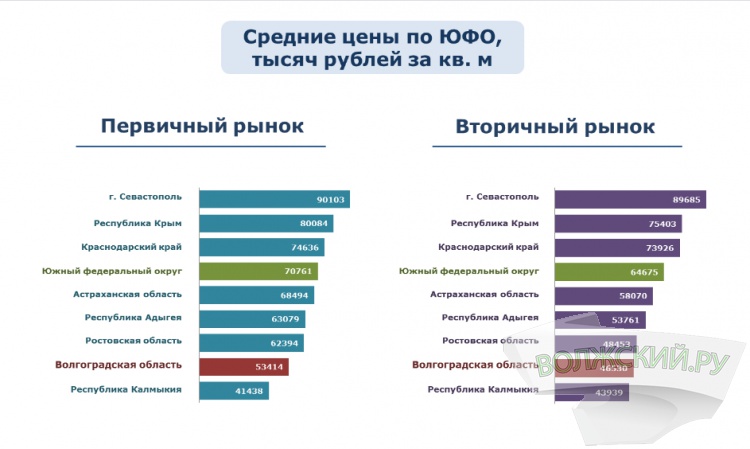 Вместе с тем, цены на жилье в Волгоградской области во II квартале оставались одними из самых низких на Юге России. Дешевле жилье только в Калмыкии. А самое дорогое – в Севастополе. Средняя стоимость 1 м2 жилья по ЮФО составляет около 70,8 тысячи рублей для первички и почти 64,6 тысячи рублей – для вторичного рынка.