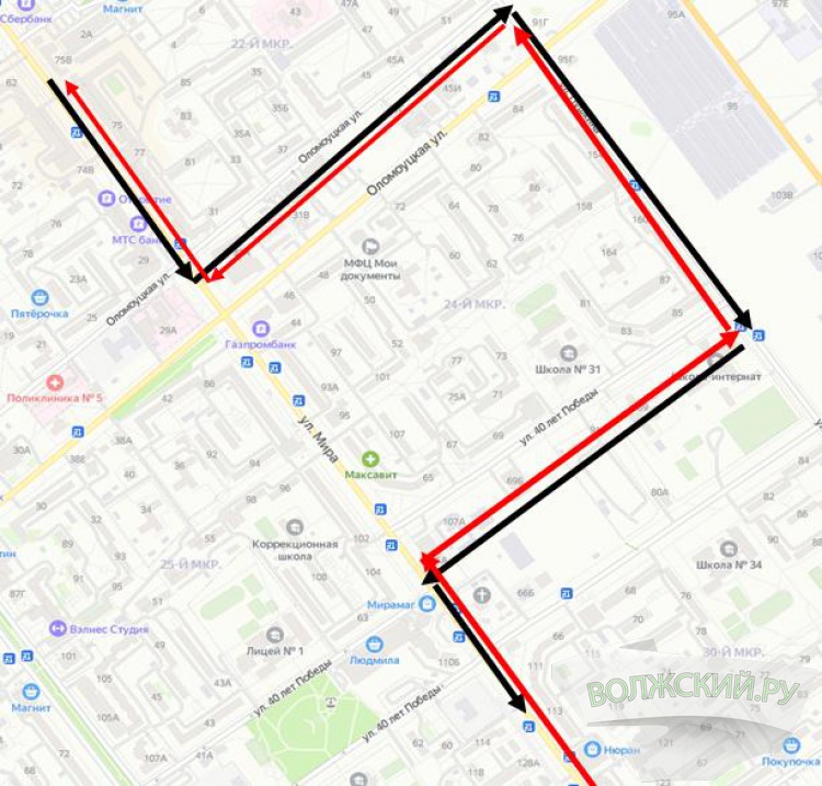 Объезд будет осуществляться по улицам Оломоуцкой (малой), Пушкина и 40 лет Победы. По объездной части маршрута автобусы будут следовать без остановок.