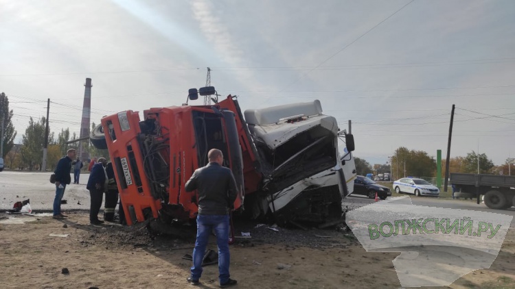 Как сообщили Волжский.ру в пресс-службе ГУ МВД по региону, на регулируемом перекрестке столкнулись тягач «МАЗ» с порожним прицепом и самосвал «КамАЗ», груженый шлаком. Оба грузовика следовали по 6-й Автодороге навстречу друг другу. По предварительной информации, 44-летний водитель «МАЗа» на перекрестке совершал левый поворот и не уступил дорогу. От сильного удара самосвал опрокинулся. Видно, что у него сильно повреждена кабина.