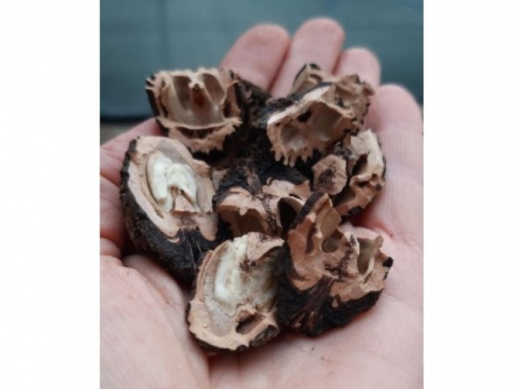 В ботаническом саду в этом году собрали уже второй урожай орехов. Эти орехи похожи на грецкие. Они вкусные и очень полезные, богаты йодом и тианинами, а также витаминами и аминокислотами. Они оказывают противовоспалительное, заживляющее, мочегонное, желчегонное и укрепляющее действия.