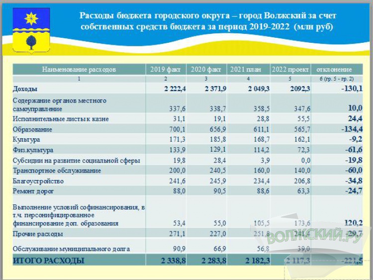 В конечном итоге, в 2022 году бюджет города Волжского недополучит почти 466 миллионов рублей. Выпадающие доходы вызвали значительную озабоченность волжских чиновников в преддверии подготовки городского бюджета на следующий год. Так, из-за острой нехватки средств придется сократить финансирование важнейших отраслей: образование, культура, социальная сфера, спорт, транспортное обслуживание, благоустройство. Причем экономить придется не на каких-то излишествах, а на самом необходимом, в том числе, зарплатном фонде, что в свою очередь может привести к массовых сокращениям.