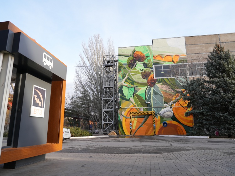 В рамках проекта на стене производственного корпуса трубоэлектросварочного цеха ВТЗ появился необычный мурал площадью более 200 кв. м. На нем изображены ветви тутового дерева с зелеными листьями, оплетенные нитями шелкопряда, а на заднем плане — стальные трубы, которые производит ВТЗ. Выбор темы не случаен — шелковица, или тутовник — один из символов города Волжского, яркий образ, олицетворяющий историческую преемственность и неразрывную связь промышленного производства в Заволжье и экологических инициатив волжских металлургов.