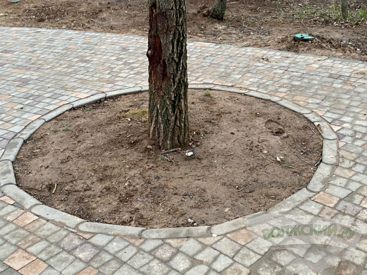 Центральная пешеходная аллея в этой части сквера упирается в неблагоустроенную территорию. В глаза бросается необычная укладка бордюра вокруг канализационных люков и деревьев.