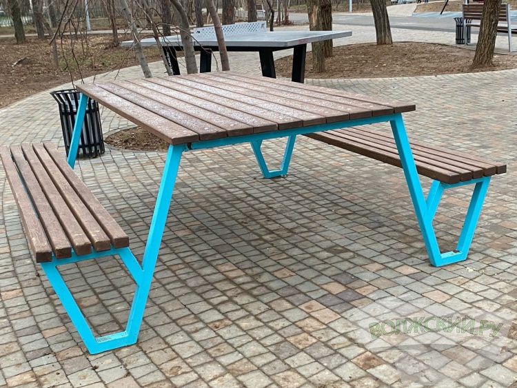 Здесь же стоит стол, сразу соединённый со скамейками. Он расположен в отдалении и пользуется спросом у компаний, желающих скрыться от посторонних глаз.