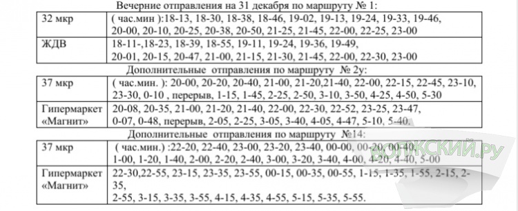 В Новый год, 1 января, автобусы № 1, 2 , 2у, 4, 11, 14, 27 и 34 работают по расписанию выходного дня с частичной отменой утренних отправлений. Только маршрут № 24 будет работать без изменений. Маршрут № 5 на праздники отменен.