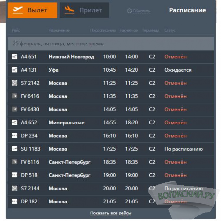 На данный момент «по расписанию» остаются два вылета в Москву, в статусе «ожидается» – рейс в Уфу. О причинах отмены рейсов не сообщается. Напомним, Волгоград предлагалось использовать для переправки пассажиров, у которых вылет/прилет ожидался в аэропорты Ростова-на-Дону и Элисты (подробнее...).