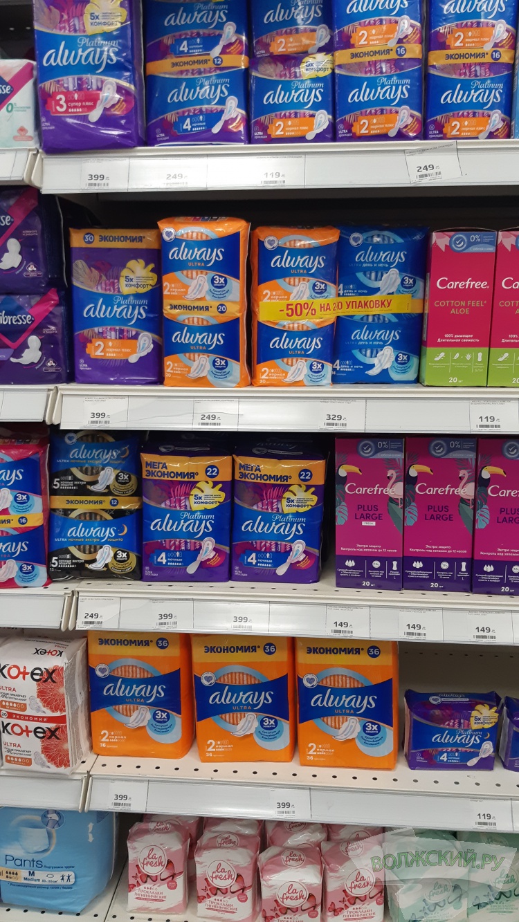 С прилавков быстро смели прокладки всех видов. В новой выкладке товар появился уже значительно подорожавшим. Волжский.ру прошелся по магазинам и сравнил цены на гигиенические прокладки. В разных торговых сетях цена на востребованную продукцию поднялась до 2 раз. Единой ценовой политики нет – цены, похоже, целиком зависят от аппетитов продавца.