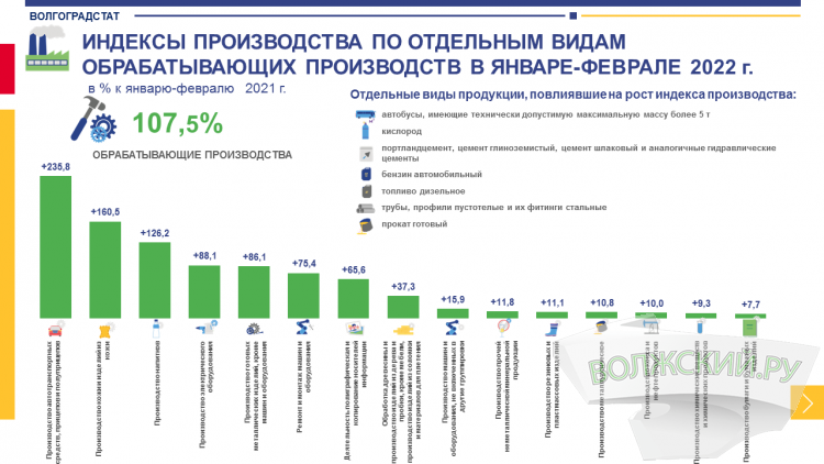 В Волгоградской области в январе-феврале 2022 года увеличился объём выпуска продукции по виду экономической деятельности «Обрабатывающие производства».