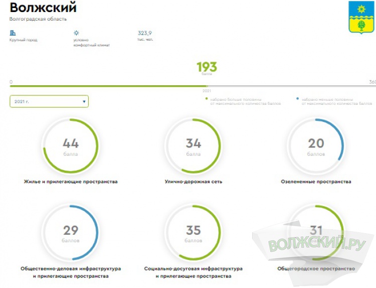 Волжский занял 35 место из 56 возможных в группе «крупных» городов». Как узнал Волжский.ру из отчёта, он набрал 193 балла из 360 возможных и вошёл в число городов с благоприятной городской средой. В 2019 году город получал 167 баллов, а в 2020 году – 181 балл. Самые плохие показатели зафиксированы по озеленению пространства и развитию общественно-деловой инфраструктуры. А ведь в далёком 2004 году Волжский получал титул «самого зелёного города страны» (подробнее...). Правда, согласно рейтингу, показатели по озеленению с 2019 года выросли с 15 до 20 баллов даже после прошлогоднего нашествия златки (подробнее...).