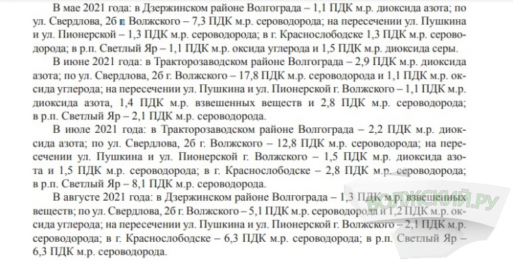 Как узнал Волжский.ру, в документе дублируют отчёты Росгидромета и МБУ «Служба охраны окружающей среды», о которых мы писали ранее. Согласно первому ведомству, уровень загрязнения атмосферы повысился с низкого до повышенного. Так, в 2017 году он составлял 5,6, в 2020 году упал до 2, а в 2021 году вновь подскочил до 5. Правда, специалисты несколько раз уточняют причину такого роста: показатель изменился из-за введения новых нормативов СанПиН 1.2.3685-21 и ужесточения нормативов по взвешенным веществам и формальдегиду. Волжские экологи вообще упустили этот момент и сократили до минимума подробности по превышениям (подробнее...).