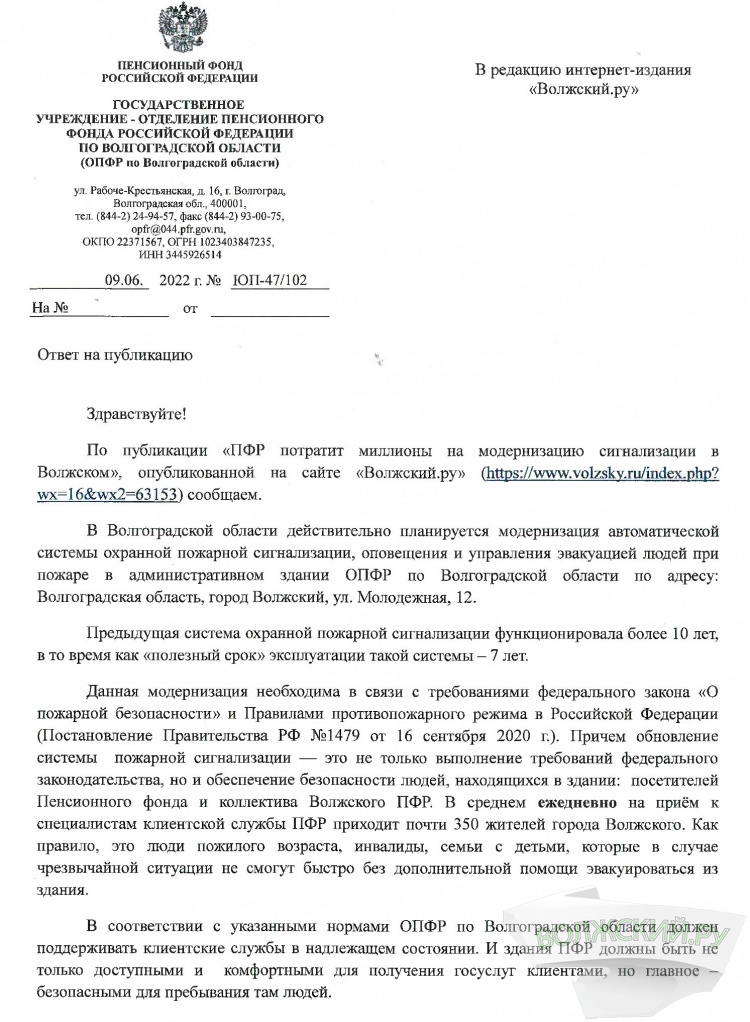 В ответ на публикацию Волжский.ру о многомиллионных тратах на пожарную сигнализацию в Волжском (подробнее...), местное отделение ПФР прислало своё видение ситуации, публикуем его полностью.