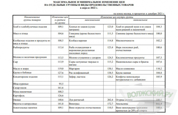 Отдельная глава отчёта посвящена ценам на товары и услуги по данным на апрель 2022 года. Исследование даёт чёткую картину об изменении ценников на товары и услуги в первые месяцы санкций. Как стало известно Волжский.ру, согласно усреднённым данным, продукты с января по апрель подорожали на 14,6%, а непродовольственные товар – 13,3%. А вот по отдельным категориям цифры просто зашкаливают. Так, только за 4 месяца года хлопья из злаков стали дороже на 23%, маргарин – на 30%, рис шлифованный – на 38,5%, сахар-песок -- на 61,6%, виноград – на 72,7%, а репчатый лук – на 102% (!) Стоимость условного минимального набора продуктов питания на конец апреля составил 5590,1 рубля на 1 человека. И вырос с начала года на 18,9%.