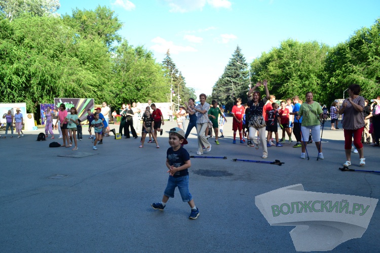 Старт развлекательной программе дала физкультзарядка около главной сцены. Разминка привлекла как юных волжан, так и представителей старшего поколения. Затем поклонники скандинавской ходьбы отправились на прогулку по периметру парка, а у сцены заработали разнообразные спортивные площадки.