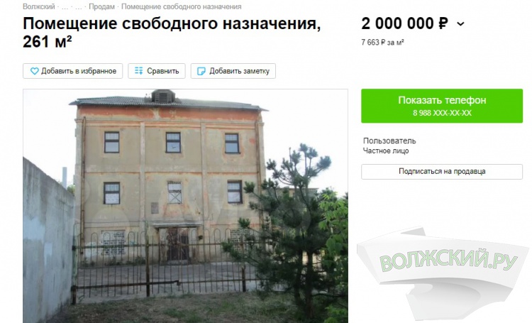 Как узнал Волжский.ру, один из лотов - здание на улице Советская, 2а, в котором в начале XX века располагалась мельница, а во время Великой Отечественной войны наблюдательный пункт 822 артполка 300 стрелковой дивизии. Много лет назад 3-этажный дом передали в частные руки. Строение находится в плачевном состоянии, и продавец не скрывает, что оно нуждается в ремонте. Возможно поэтому столь знаковый для города объект площадью 261 м2 и участок в 4 сотки продают по цене двухкомнатной квартиры в 40-50 квадратов: всего за 2 миллиона рублей. В здании предлагают разместить офисы, гостиницу или частный дом.