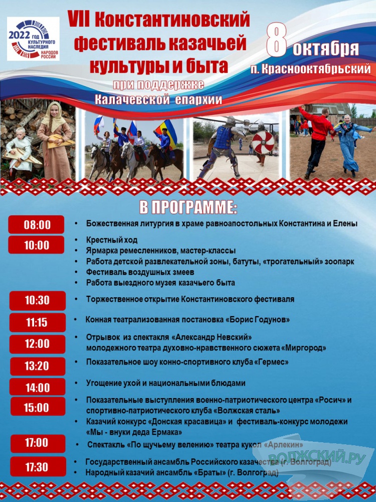 В субботу, 8 октября, в поселке Краснооктябрьский состоится традиционный фестиваль казачьей культуры и быта. Константиновский фестиваль пройдет в седьмой раз и будет иметь историко-патриотическую направленность.