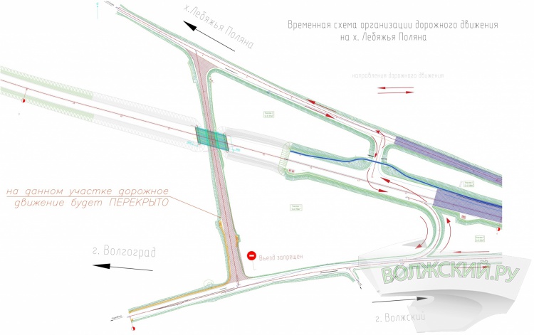 Изменения касаются переноса поворота с трассы к хутору Лебяжья Поляна. Как сообщили Волжский.ру в комитете транспорта и дорожного хозяйства Волгоградской области, из-за проведения работ по строительству 1 этапа Третьего пускового комплекса мостового перехода через реку Волгу съезд с дороги в направлении хутора перекрыт. Здесь завершаются работы по строительству транспортной развязки на ПК 45. Для движения в сторону Лебяжьей Поляны устроены новые съезды. Движение будет осуществляться по схеме.