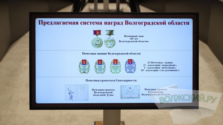 Согласно проекту, самым значимым станет звание «Почётный гражданин Волгоградской области». Далее будут следовать ордена и медали Волгоградской области, почётные знаки губернатора и регионального парламента, областные почётные звания по различным отраслям и сферам деятельности, почётные грамоты главы региона и областной Думы. Принять законопроект хотят уже в декабре.