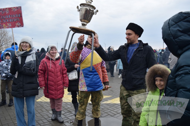 Игры и забавы проводились на площадке прямо в толпе зрителей. Одни волжане фотографировались с ростовыми куклами-скоморохами, другие поднимали самовар, третьи участвовали в перетягивании каната.
