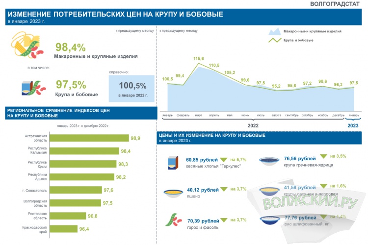 Как сообщили Волжский.ру в территориальном органе госстатистики, за прошлый год макаронные и крупяные изделия в среднем подешевели на 1,6%. При этом крупа и бобовые стали дешевле на 2,5%. Цена на хлопья «Геркулес» снизилась на 5,7%, пшено, горох и фасоль - 3,7%, гречку - 3,5%, овсянку и перловку - 1,6%, рис - 1,4%. Согласно представленной инфографике, уже в январе 2023 года кривая цен снова начала ползти вверх.