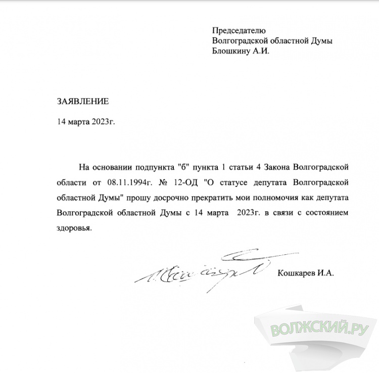 Во вторник, 14 марта, Волгоградская облдума приняла заявление депутата. Как узнал Волжский.ру из повестки заседания (подробнее...), в качестве основания досрочного ухода парламентарий сослался на состояние здоровья. Прекратить свои полномочия он просил с 14 марта 2023 года.