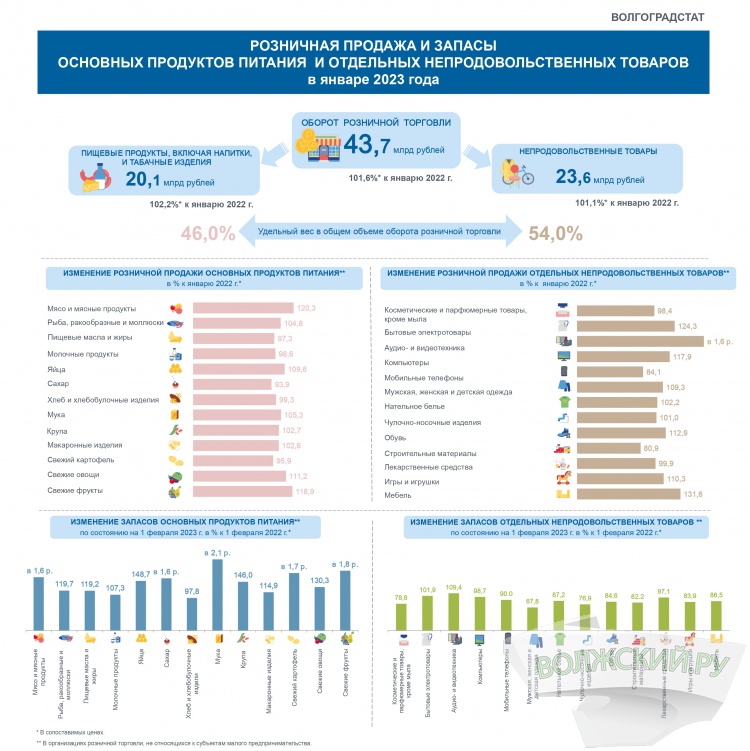 Волгоградстат подсчитал запасы продовольственных и непродовольственных товаров в организациях розничной торговли на 1 февраля 2023 года.
