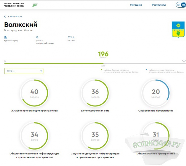 Индекс качества рассчитали для 1117 городов страны. Городскую среду признавали благоприятной, если индекс превышает 180 баллов. Как узнал Волжский.ру из отчёта, Волжский в своей группе занял 50 место из 60 с показателем в 196 баллов из 360 возможных. В 2022 году было 193. К слову, уровень озеленения эксперты оценили на прошлогоднем уровне – в 20 баллов, а вот в категориях «жилье и прилегающее пространство», а также «улично-дорожная сеть» город получил несколько дополнительных баллов.