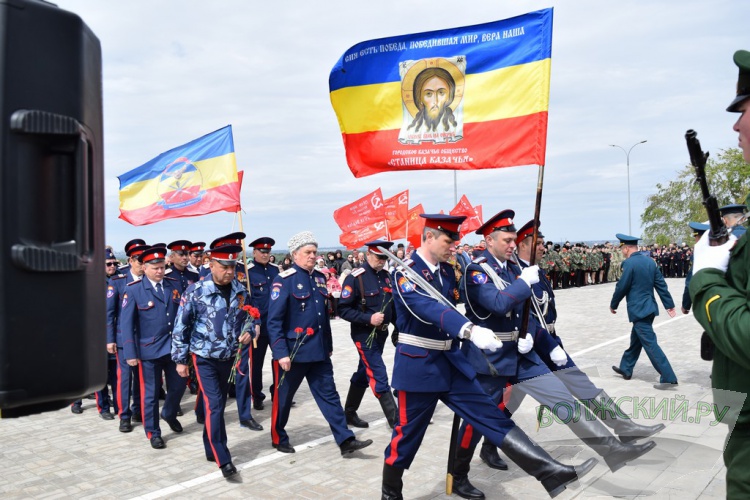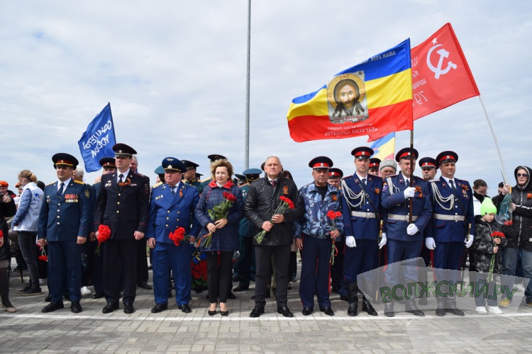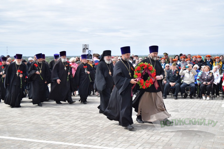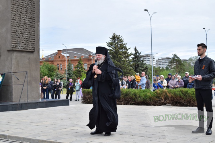 Епископ Калачевский и Палласовский Иоанн напомнил собравшимся, что День Победы весной 1945 года пришелся на пасхальную седьмицу и сегодня он отмечается после Пасхи. Он призвал волжан верить в лучшее, в Воскресение и вечную жизнь. Священнослужитель выступил с предложением освятить в Волжском православный храм в честь Святителя Николая в память о Никольской церкви, которая до войны находилась на месте монумента.