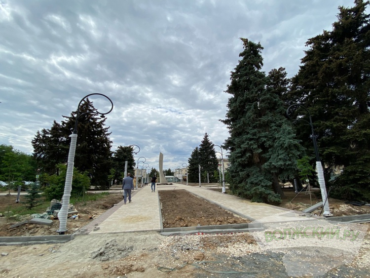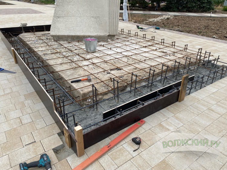Из этого же материала и в той же гамме обустроят основание стелы. Ранее его покрывали гранитные плиты черного цвета. Первоначально планировали уменьшить площадь постамента и вернуть плиты на место. Затем выяснилось, что изменить размеры монолитного основания невозможно. Остановились на брусчатке. В настоящее время рабочие устанавливают опалубку, затем приступят к заливке бетона. Для удобства волжан (например, для возложения цветов) к монументу обустроят несколько лесенок.
