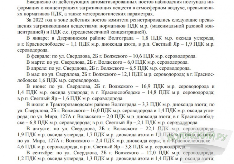 Как стало известно Волжский.ру из документа, по данным поста Волгоградского ЦГМС на улице Набережная, уровень загрязнения атмосферы в Волжском эксперты оценили как повышенный. При этом уточнили, что изменение оценки уровня загрязнения атмосферного воздуха и увеличение индекса обусловлено ужесточением нормативов по взвешенным веществам и формальдегиду. По данным трёх постов облкомприроды, в августе прошлого года превышение максимально разовой ПДК по сероводороду достигало 22,1 ПДК, в июле – 16 ПДК, а в июне – 16,9 ПДК. В результате в зоне действия автоматизированных постов в Волжском загрязнение воздуха оценили как высокое.