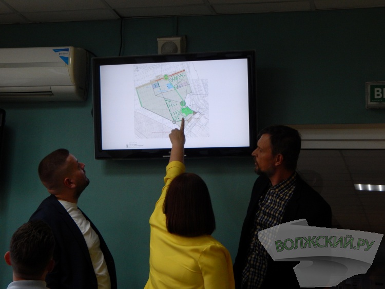 Предпроектные решения на экране небольшого телевизора представил Денис Востриков, и в процессе ему не раз приходилось уточнять расположение будущих зон, буквально указывая пальцем на плане. Сначала волжане изучили предлагаемое изменение участка парка «Волжский» от памятника жертвам политических репрессий в сторону рынка.