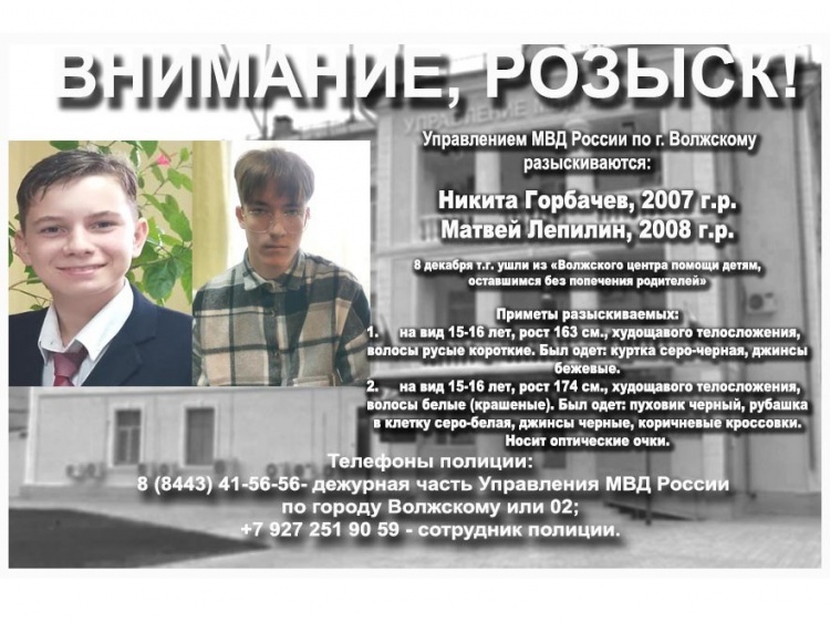 Как сообщили Волжский.ру в ГУ МВД по Волгоградской области, 8 декабря Никита Горбачев и Матвей Лепилин ушли из «Волжского центра помощи детям, оставшимся без попечения родителей» и до настоящего времени их местонахождение не установлено.