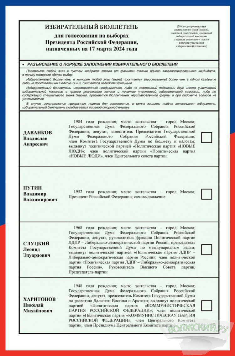 Как сообщили Волжский.ру в пресс-службе центризбиркома, в бюллетене в алфавитном порядке перечислены 4 кандидатуры, из которых жители выберут президента на следующие 6 лет. Каждому из кандидатов отведены равные по площади части, разделенные черными линиями. В них указывается год рождения кандидата, место жительства, место работы. Также указывается принадлежность к политической партии, если кандидат пожелал указать эту информацию, и кем он выдвинут на выборах. Документ также содержит инструкцию по его заполнению.