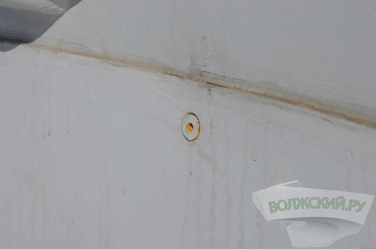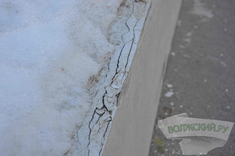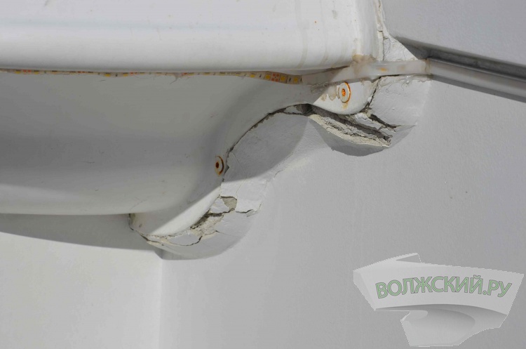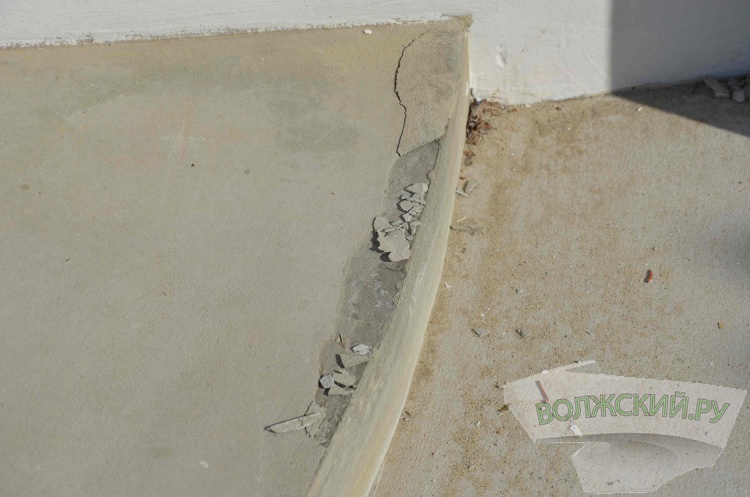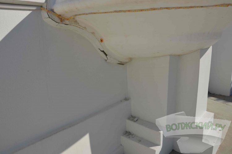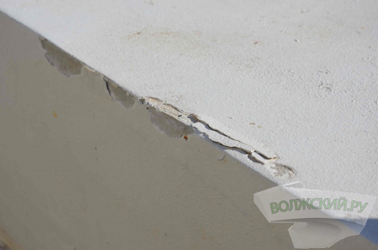 Так, по всему периметру конструкции видны трещины, штукатурка отваливается кусками практически со всех углов и бортиков и пузырями торчит на ровной поверхности.