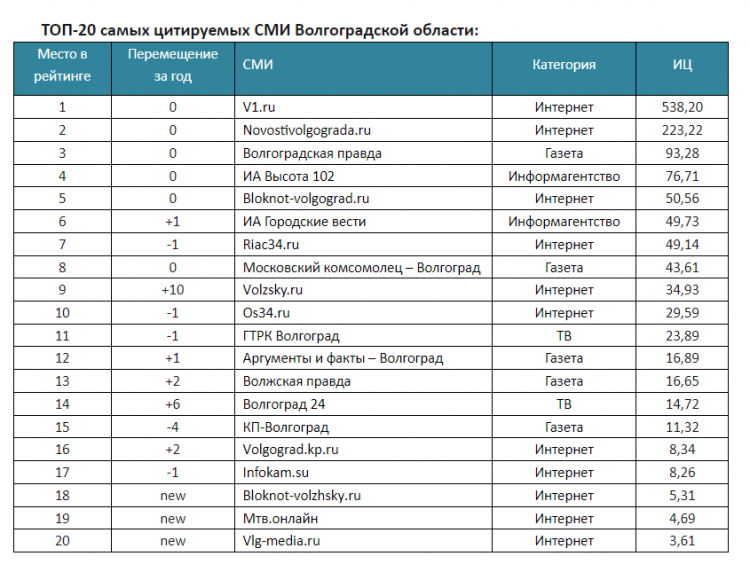 Лидерами рейтинга цитируемости стали такие издания как V1, НовостиВолгоград.ру, Волгоградская правда. А замыкают рейтинг Блокнот-Волжский, MTV.Онлайн и Vlg-media.