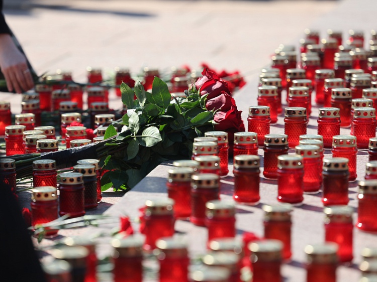 Тем временем в Волгограде жители несут цветы и зажигают лампады в память о погибших у монумента на Аллее Героев.