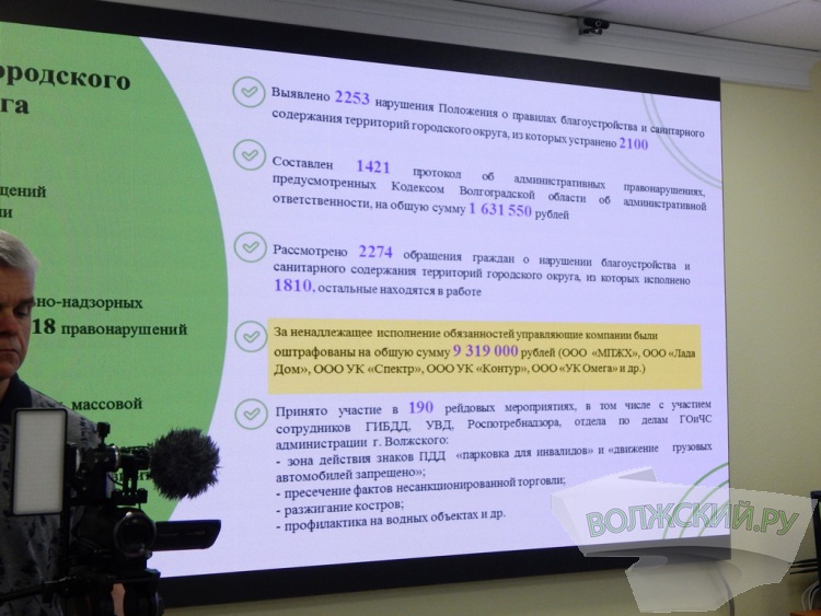 Особо мэр подчеркнул работу с управляющими компаниями. За прошлый год городские УК были оштрафованы более чем на 9,3 миллиона рублей за неисполнение своих обязанностей. Здесь, в основном, речь шла об обледенелых дворах и отсутствии расчистки дорог. Всего по фактам нарушения городских правил благоустройства на граждан за прошлый год в Волжском составили 1421 протокол на 1,63 миллиона рублей.